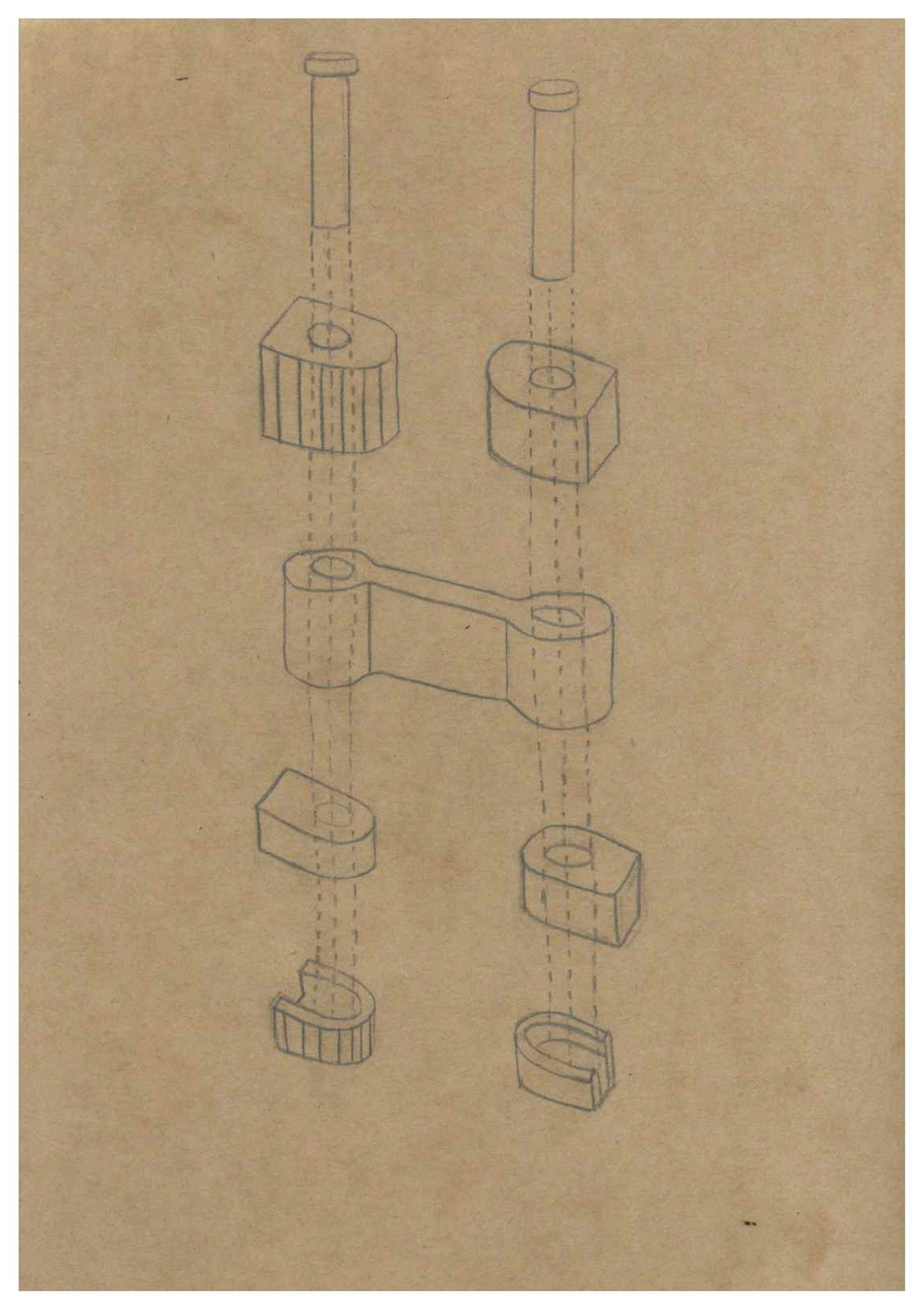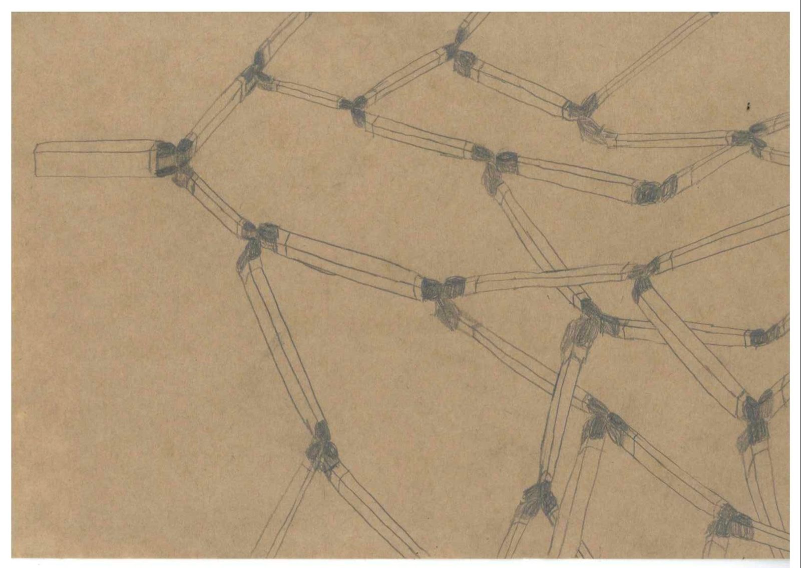 이전에 그린 스케치를 좀 더 발전시켜서 모형이 두 방향으로 갈라지며 계속 이어지는 구조를 그려보았다. 계속 스케치하다 보니 여러 방향에서 뻗어져 나온 모형들끼리 새로운 공간을 만들어내는 모습을 발견했다. 이후 내가 처음 사물을 선정한 이유에 대해 다시 생각해 보게 됐다. 새로운 공간을 만들어내는 것이야말로 가장 공간을 자유롭게 활용할 수 있는 방법인 것 같다고 생각했고, 이러한 구조를 모형을 만들어 표현하고자 했다.