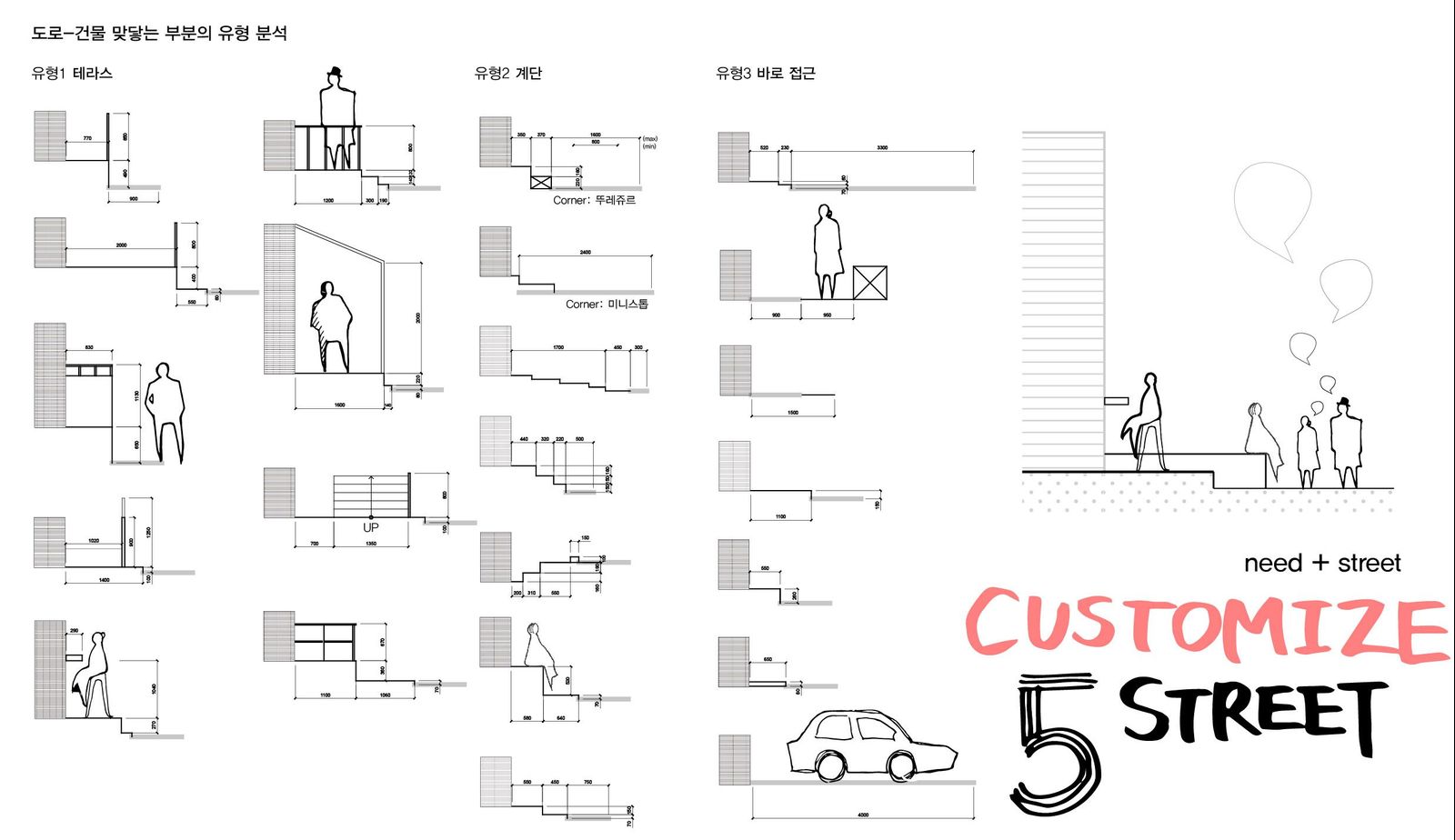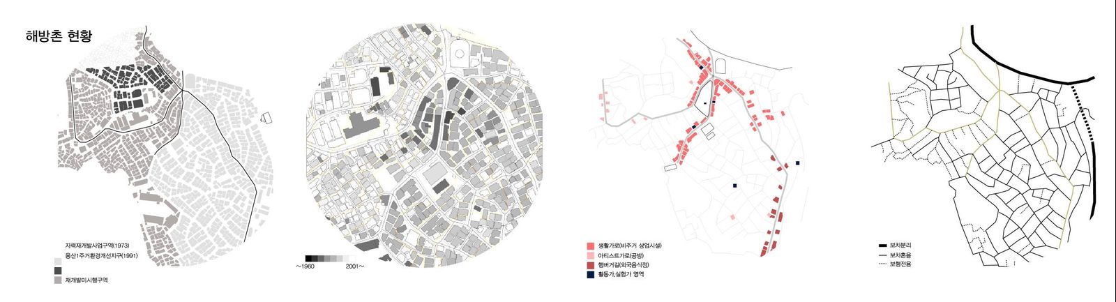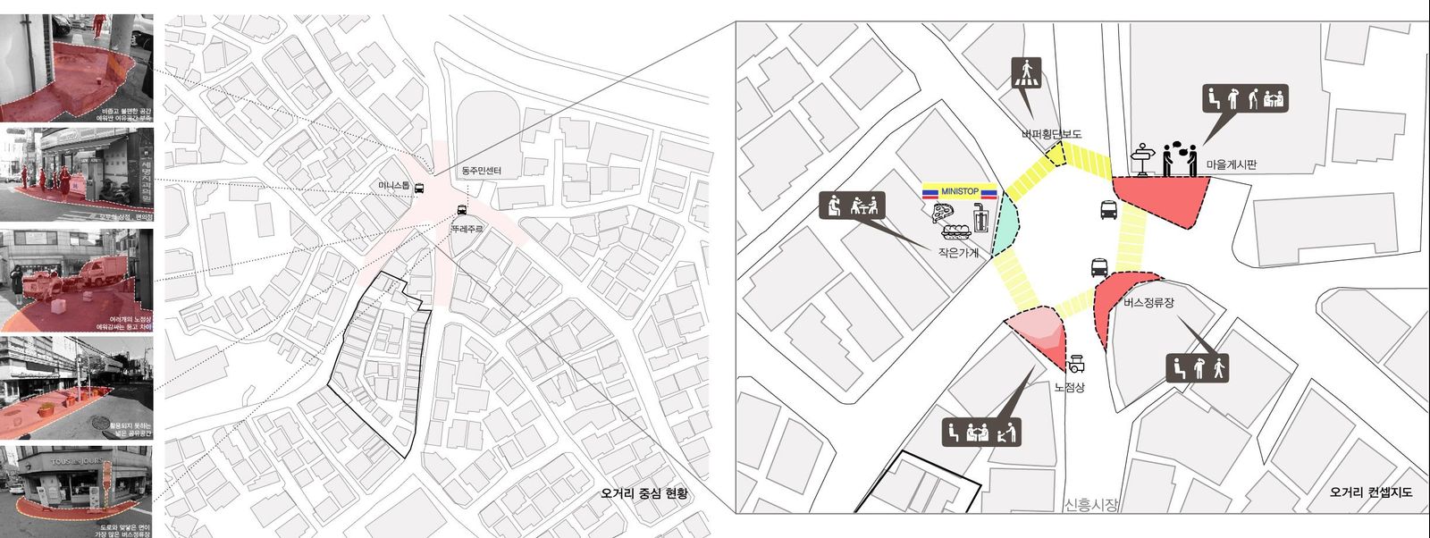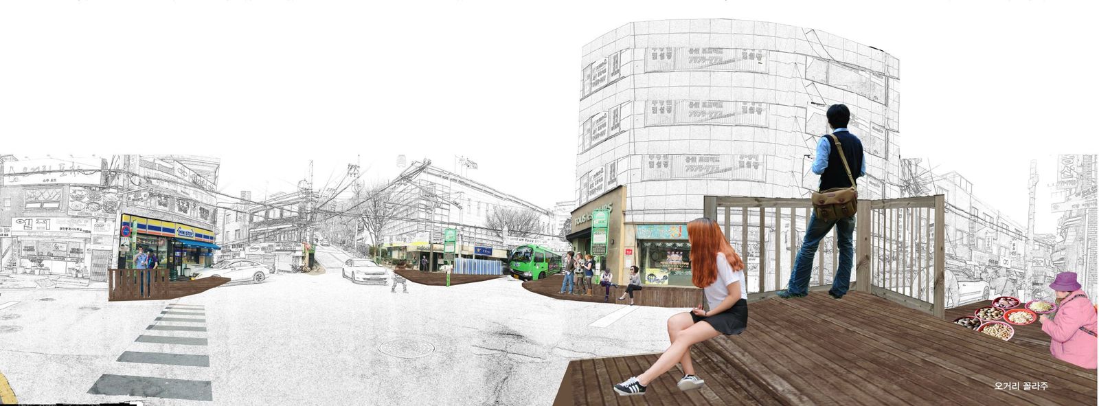 해방촌은 현재 소위 말하는 핫플레이스라 불리우지만 오거리, 윗동네는 사뭇다르다. 오거리와 신흥시장일대는 재개발에서 소외된 채 그 모습을 간직해 왔고 우리는 주민들의 필요한 공간과 해방촌이 간직한 물리적인 환경을 결합하여 오거리를 디자인을 고려하였다. 물리적인 환경으로서 도로와 건물이 맞닿는 부분을 분석하였고 분석결과 테라스, 계단, 바로접근형으로 유형화가 이루어졌으며 그에 따라 좋은 공간과 좋지않은 공간들을 찾아내었다. 차량과 보행자의 통행이 맞물려 발생하는 오거리에서 코너에 해당하는 각각의 공간을 분석하여 오거리 디자인을 제시하였다.