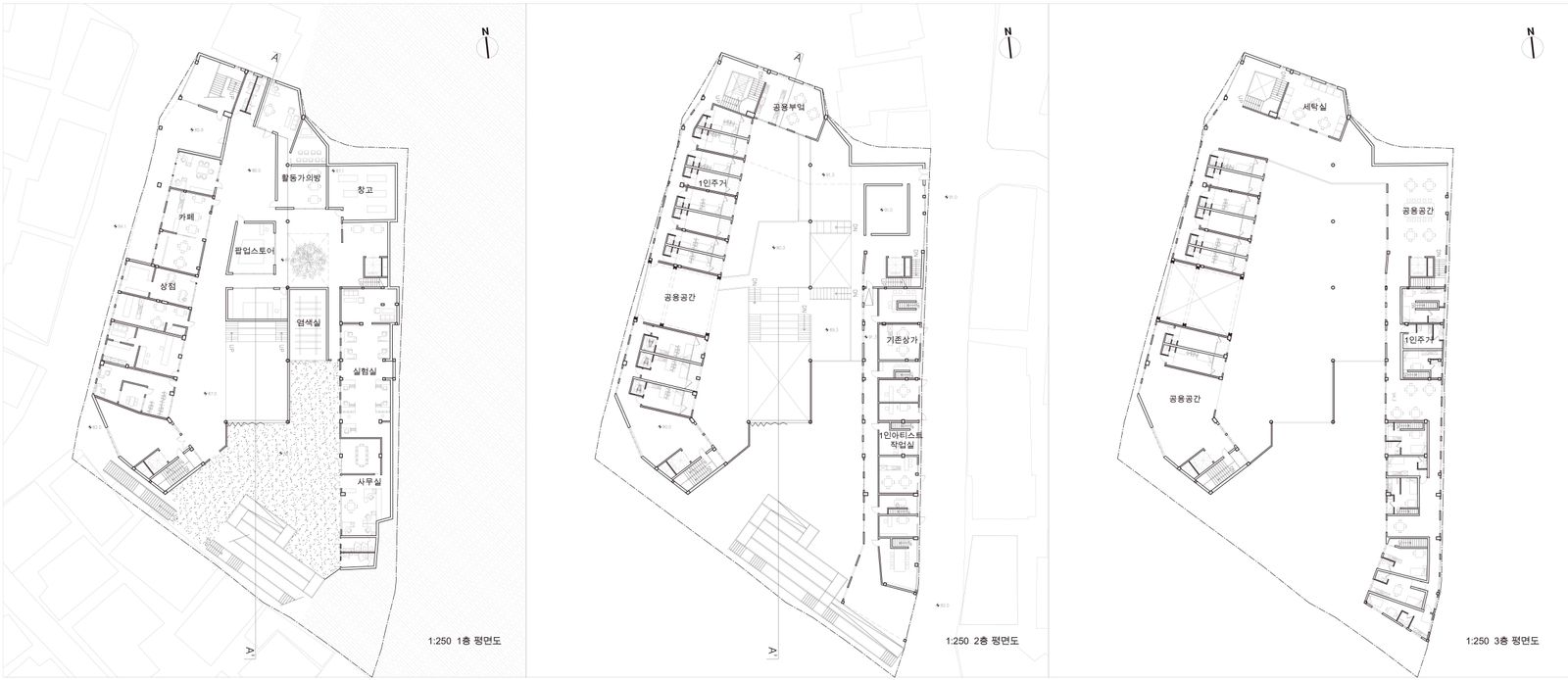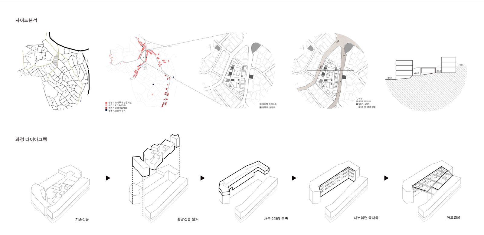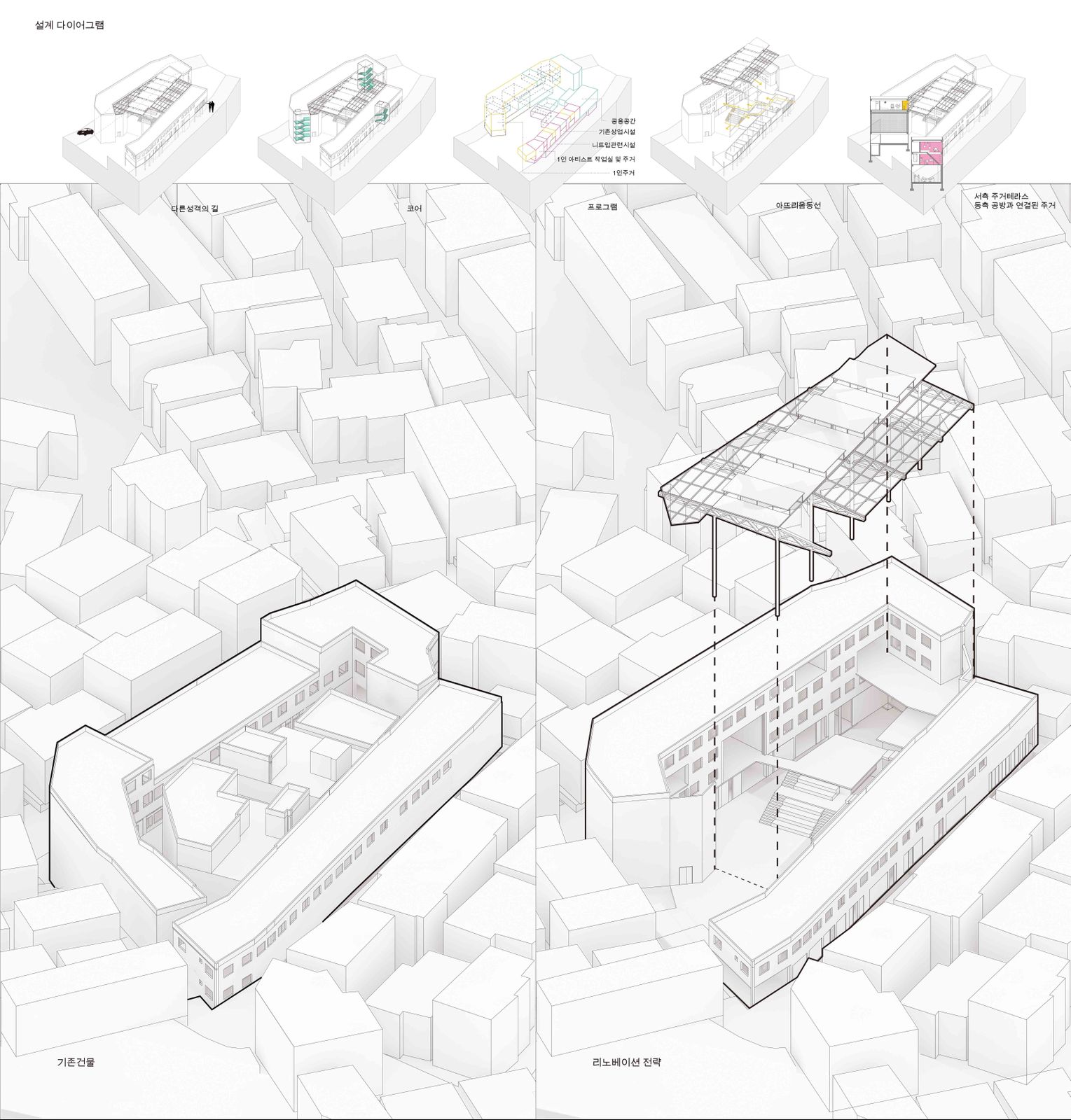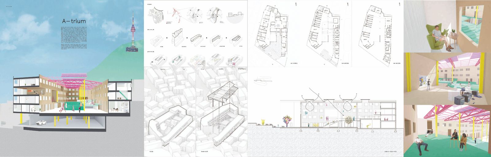 해방촌은 다른 도시재생 사례와는 다르게 새로 유입된 사람들에 의해 활동이 일어나고 있는 곳이다. 따라서 해방촌이 좋아서, 집값이 싸서 모인 활동가, 청년들이 정착할 수 있는 1인주거를 고려하게 되었다. 1인주거이지만 신흥시장 내에서 일어나는 일들로부터 고립되지 않아야 한다고 생각하였고 이는 아뜨리움과 주거테라스와의 관계로 이어졌다. 비교적 규칙적인 창문 모양을 발견하여 기존의 외벽을 이용한 입면을 활용하고자 하였고 이를 극대화시키기 위해 서측 주거동을 2개층 증축하였다. 아뜨리움과 연결시켜 내부입면으로 전환시키며 공용공간(아뜨리움)과 사적공간사이의 관계를 생각해 보게하며 단순히 입면이 아니라 그들의 공유공간을 보여줌으로써 시각적 교류를 의도하였다. 또한 아뜨리움은 단순히 큰 공간으로 비워두는 것이 아니라 니트업 프로그램과 관련된 활동공간으로 쓰이며 미이용시에도 자연스러운 활동이 일어날 수 있도록 설계하였다. 주민들의 생활가로로 쓰이는 동측건물은 1층은 기존상권을 최대한 유지하며 니트업 프로그램과 관련된 1인 아티스트들을 위한 공간으로 설계하였다. 1인 아티스트들을 위한 공간의 경우 공방과 주거의 결합으로 기존에 있는 구조체와 계단을 이용하여 1층 작업실, 2층 주거 형태의 공간을 제시한다.