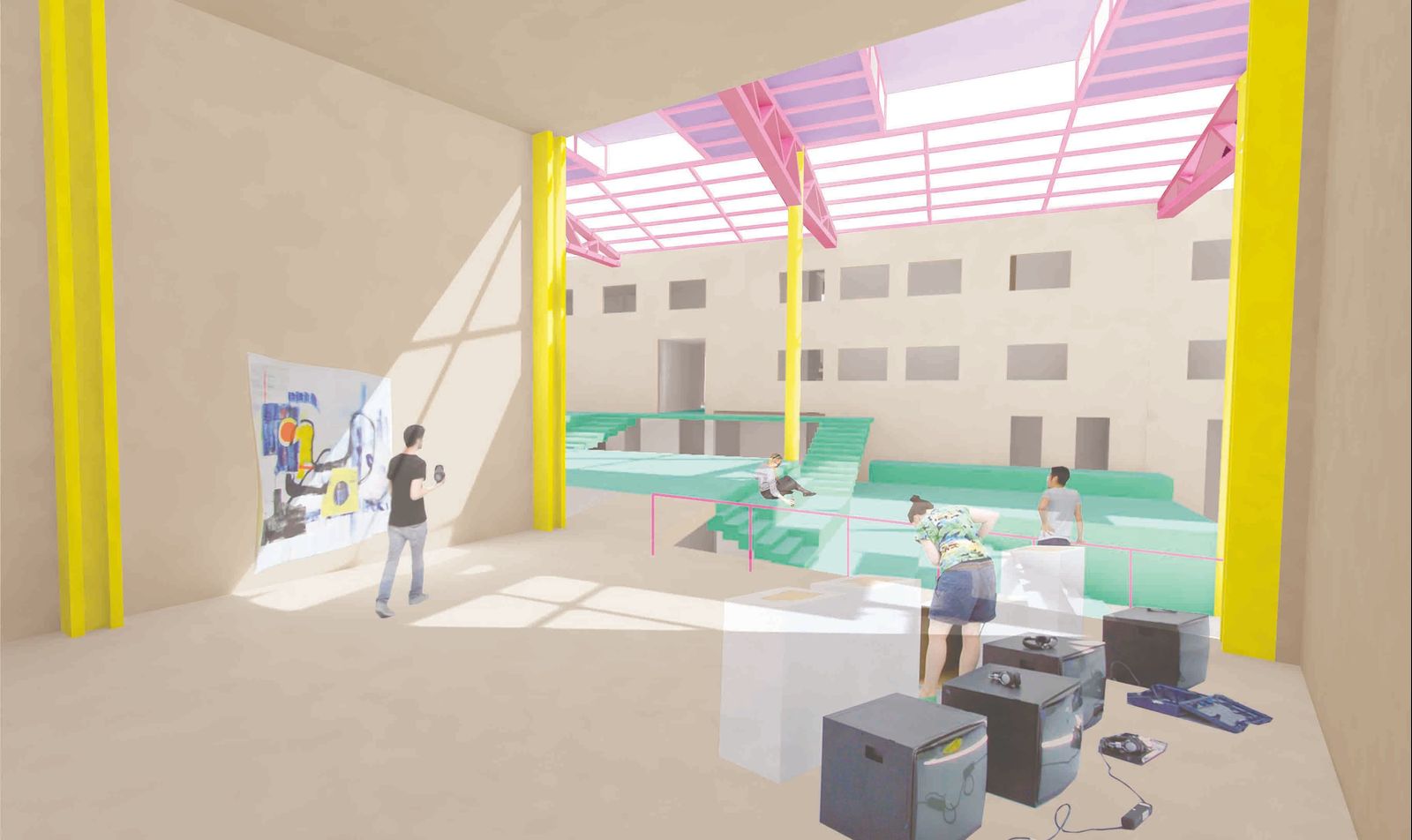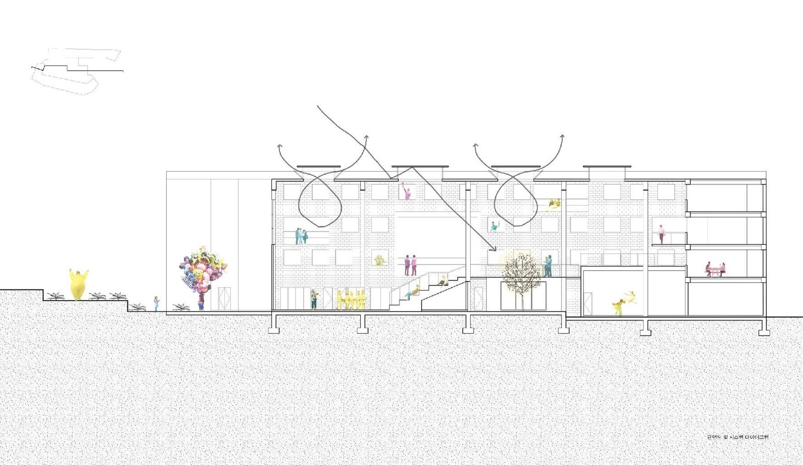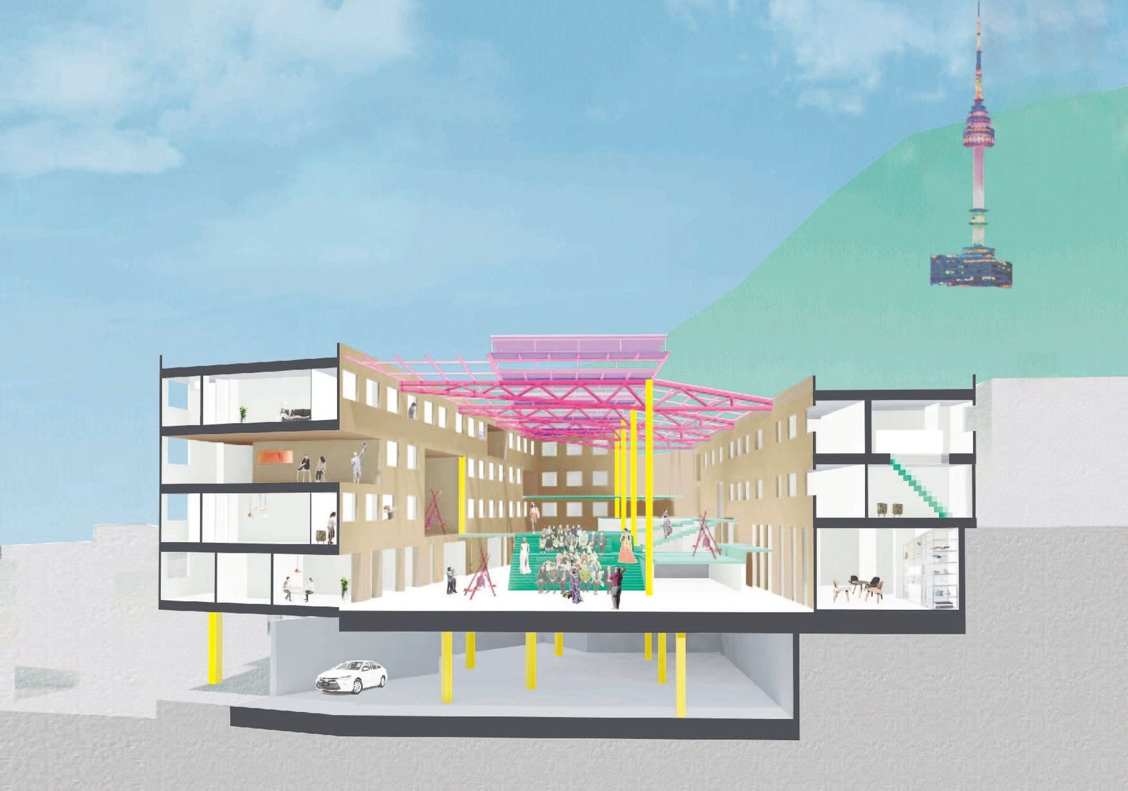해방촌은 다른 도시재생 사례와는 다르게 새로 유입된 사람들에 의해 활동이 일어나고 있는 곳이다. 따라서 해방촌이 좋아서, 집값이 싸서 모인 활동가, 청년들이 정착할 수 있는 1인주거를 고려하게 되었다. 1인주거이지만 신흥시장 내에서 일어나는 일들로부터 고립되지 않아야 한다고 생각하였고 이는 아뜨리움과 주거테라스와의 관계로 이어졌다. 비교적 규칙적인 창문 모양을 발견하여 기존의 외벽을 이용한 입면을 활용하고자 하였고 이를 극대화시키기 위해 서측 주거동을 2개층 증축하였다. 아뜨리움과 연결시켜 내부입면으로 전환시키며 공용공간(아뜨리움)과 사적공간사이의 관계를 생각해 보게하며 단순히 입면이 아니라 그들의 공유공간을 보여줌으로써 시각적 교류를 의도하였다. 또한 아뜨리움은 단순히 큰 공간으로 비워두는 것이 아니라 니트업 프로그램과 관련된 활동공간으로 쓰이며 미이용시에도 자연스러운 활동이 일어날 수 있도록 설계하였다. 주민들의 생활가로로 쓰이는 동측건물은 1층은 기존상권을 최대한 유지하며 니트업 프로그램과 관련된 1인 아티스트들을 위한 공간으로 설계하였다. 1인 아티스트들을 위한 공간의 경우 공방과 주거의 결합으로 기존에 있는 구조체와 계단을 이용하여 1층 작업실, 2층 주거 형태의 공간을 제시한다.