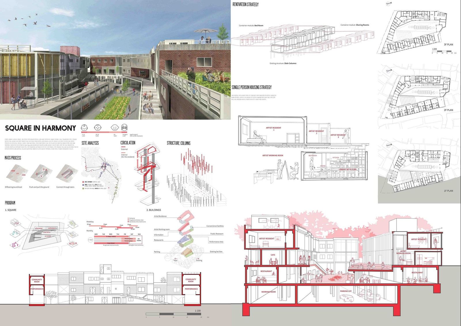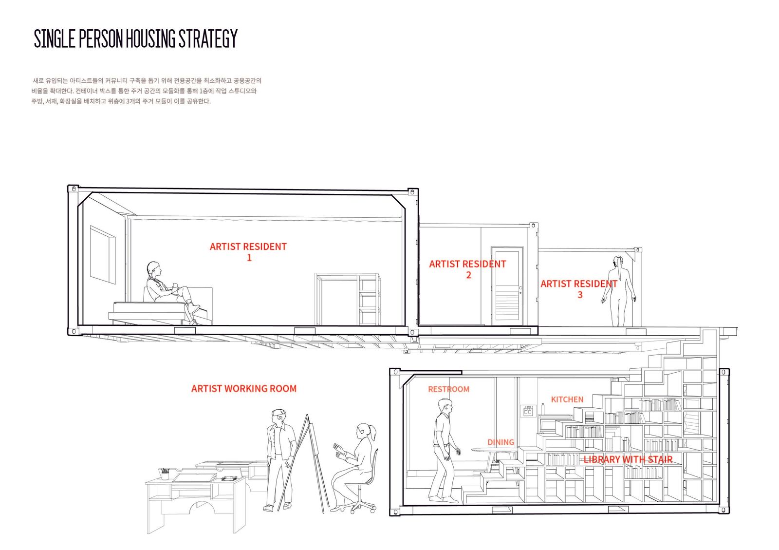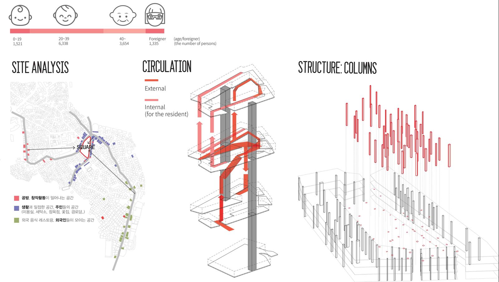 다양한 사람들이 섞여사는 해방촌. 그들 각각의 거주지 중심에 위치하는 신흥시장은 지리적으로 사람들이 모여들 수 있는 가능성을 품고 있다. 주민들이 점거하고 있는 공간을 조사한 결과 ‘해방촌’이라는 하나의 공간 안에서 원주민, 새로 유입되는 아티스트, 외국인, 이 세 부류가 차지하고 있는 영역이 뚜렷하게 나누어져 있다는 것을 알 수 있었다. 이들의 흩어져있는 커뮤니티를 묶어줄 수 있는 하나의 공간으로서 물리적인 접점에 위치한 신흥시장을 제안하였고 시간에 따라 다르게 작동하는 Open Square를 생성함으로써 유동적인 공간을 공유할 수 있도록 하였다. 또한 기존 프로그램(반찬가게, 니트공방, 마을학교)과 원주민들이 필요로 하는 프로그램(경로당, 놀이방)을 한 곳에 묶고 새로 유입되는 프로그램(공방, 식당, 상업시설) 을 광장을 기준으로 마주보게 배치하여 신흥시장이라는 한 공간에 공존하지만 개별적으로 섞이지 않도록 구획하였다. 이러한 배치는 구조물의 재료를 통해 드러난다.