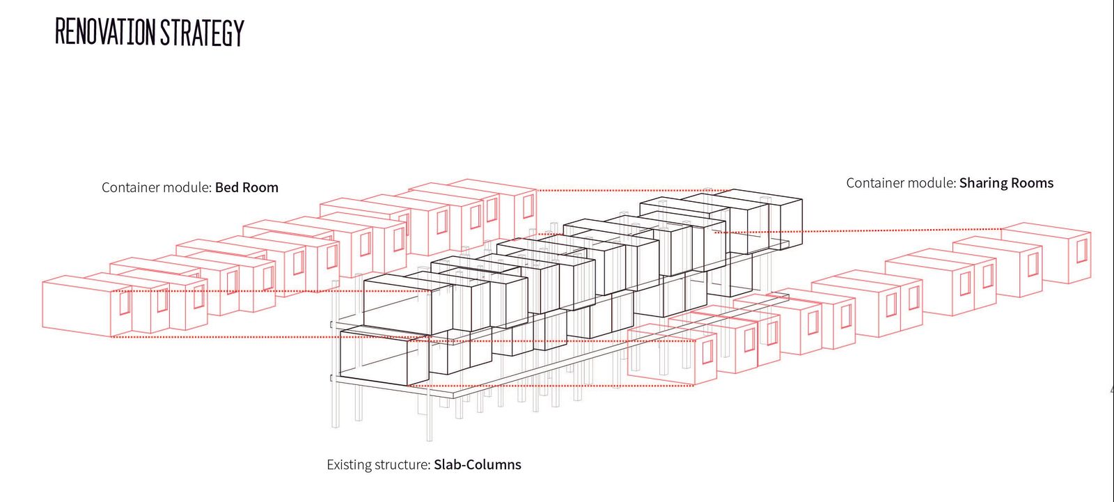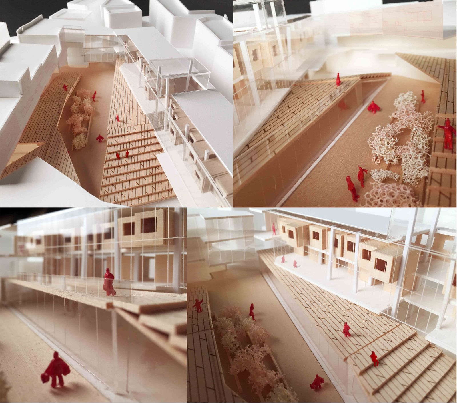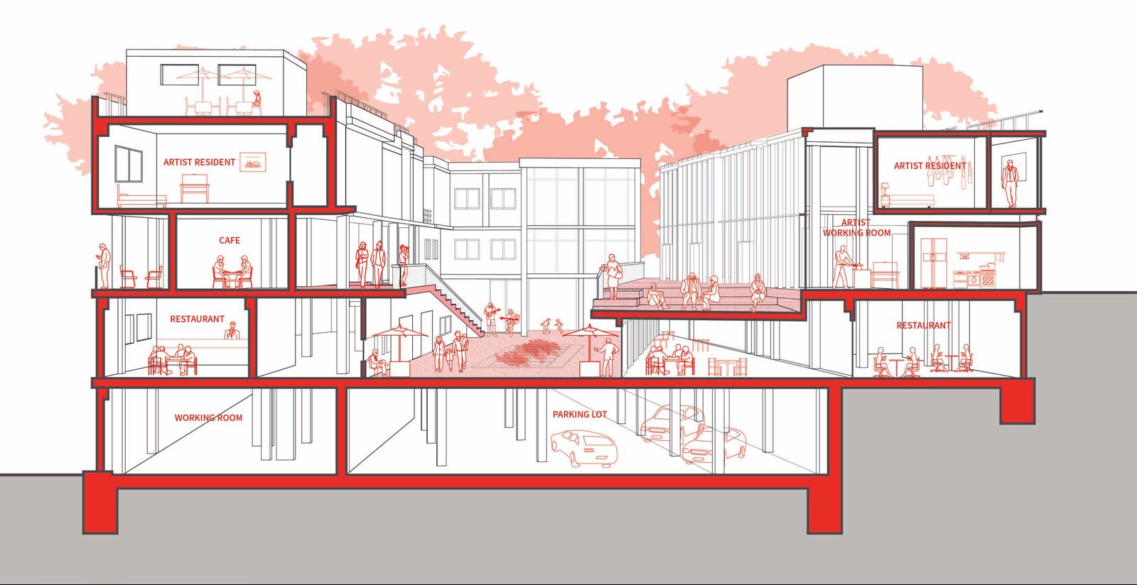 다양한 사람들이 섞여사는 해방촌. 그들 각각의 거주지 중심에 위치하는 신흥시장은 지리적으로 사람들이 모여들 수 있는 가능성을 품고 있다. 주민들이 점거하고 있는 공간을 조사한 결과 ‘해방촌’이라는 하나의 공간 안에서 원주민, 새로 유입되는 아티스트, 외국인, 이 세 부류가 차지하고 있는 영역이 뚜렷하게 나누어져 있다는 것을 알 수 있었다. 이들의 흩어져있는 커뮤니티를 묶어줄 수 있는 하나의 공간으로서 물리적인 접점에 위치한 신흥시장을 제안하였고 시간에 따라 다르게 작동하는 Open Square를 생성함으로써 유동적인 공간을 공유할 수 있도록 하였다. 또한 기존 프로그램(반찬가게, 니트공방, 마을학교)과 원주민들이 필요로 하는 프로그램(경로당, 놀이방)을 한 곳에 묶고 새로 유입되는 프로그램(공방, 식당, 상업시설) 을 광장을 기준으로 마주보게 배치하여 신흥시장이라는 한 공간에 공존하지만 개별적으로 섞이지 않도록 구획하였다. 이러한 배치는 구조물의 재료를 통해 드러난다.