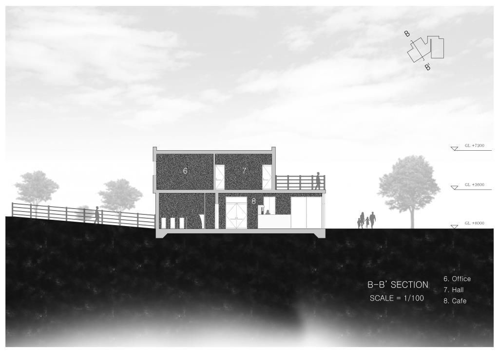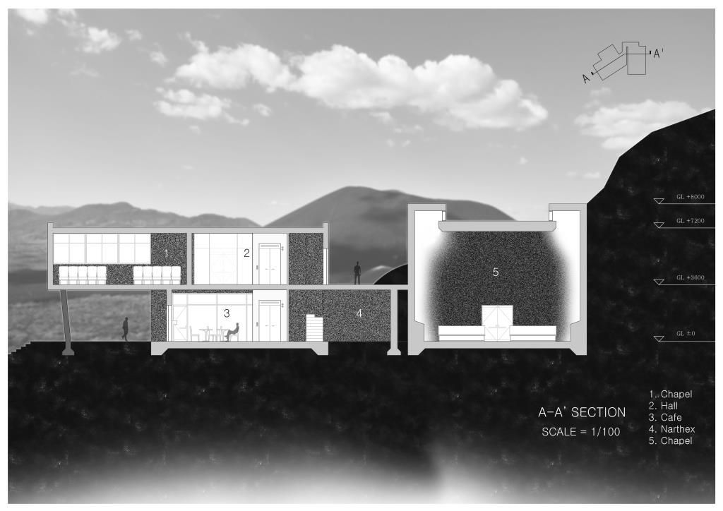 저는 사이트 주변에 거주하는 아이들과 노인분들을 위한 공간의 부족현상을 해결하고 싶었습니다. 이를 위해 사이트가 특정 종교인에게만 열린 공간이 아닌 모두에게 열린 공간이 되게끔 Chapel을 산 속에 배치하여 종교인들이 Narthex를 지날때 영적인 공간으로 가는 느낌을 더 확실하게 체감할 수 있게 하고 Chapel내부는 간접광을 활용하여 은은하지만 강렬한 감동을 주게끔 설계했습니다. 2층으로 이루어진 Building은 대지에 순응하게 배치하여 주변풍경과 조화를 이루게끔 했고, 사람들의 시선과 동선을 고려하여 내부 zoning을 했습니다. 제시하는 Program은 산책으로 사이트 전체를 넓은 평지를 낀 산책로, 숲 속 오솔길, 연못을 낀 오솔길과 같은 세 가지 형태의 산책로로 구성했습니다.