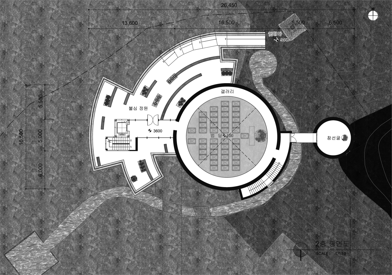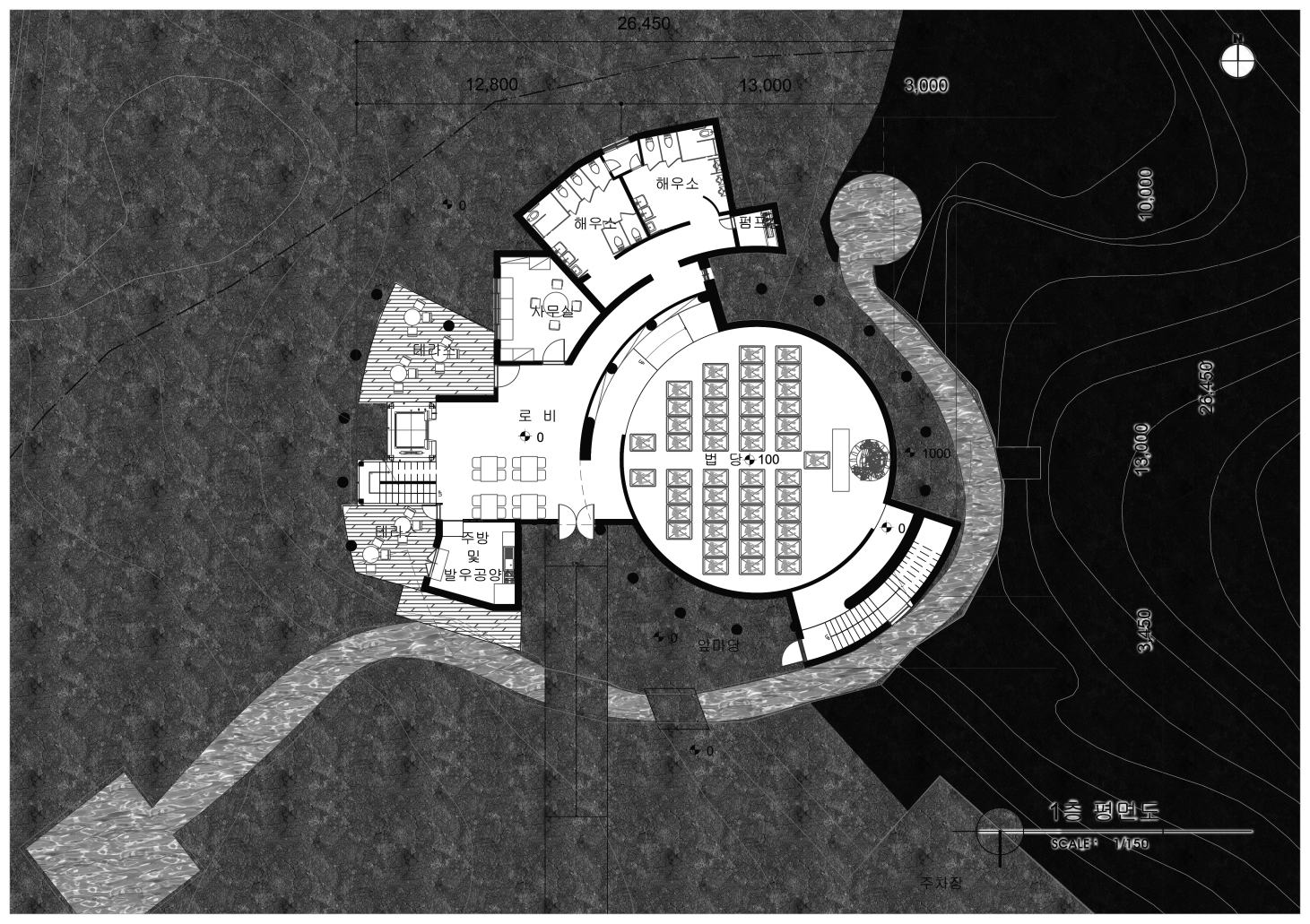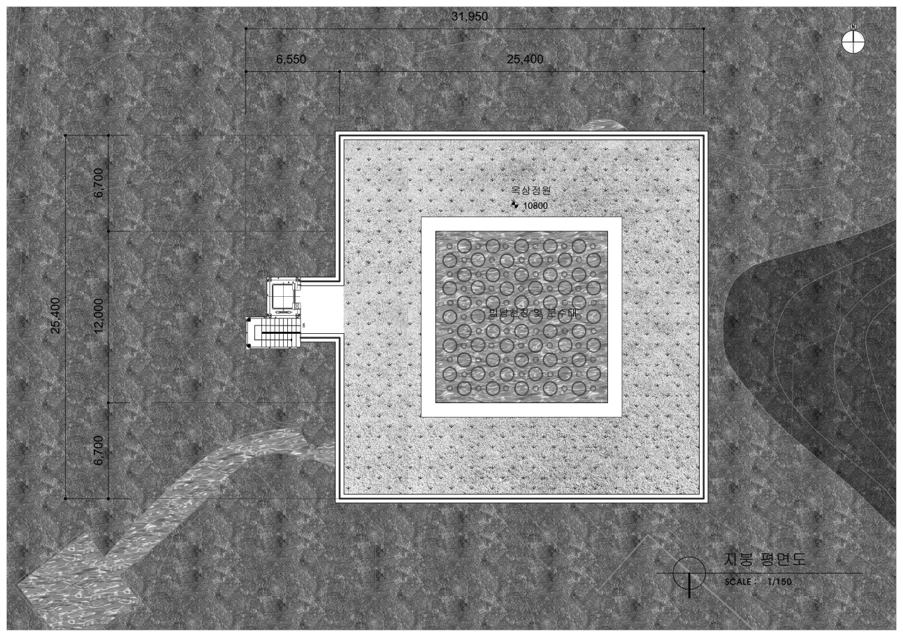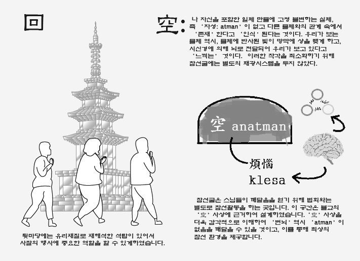 큰 컨셉은 동적인 외부공간과 정적인 내부공간의 대비로 볼 수 있다. 이러한 대비를 극적으로 표현하기 위하여 물을 사용하였다. 우리는 시끄러운 수영장에서 잠수했을 때, 그 요란스럽던 소리가 물에 의하여 먹혀서 웅웅거리는 경험을 하곤 한다. 바로 그 때 느끼는 평안함, 고요함의 감정을 법당 내에서 재현하고자 천창 위의 물을 통과하여 들어오는 빛의 공간을 설계하였다. 즉, 물 바깥의 속세와 내부의 평온한 세계로 나눌 수 있다는 것이다. 마음의 평온함은 우리가 윤회하는 속세의 덧없음을 깨닫고 열반에 이를 수 있도록 이끌어준다.