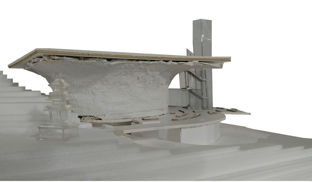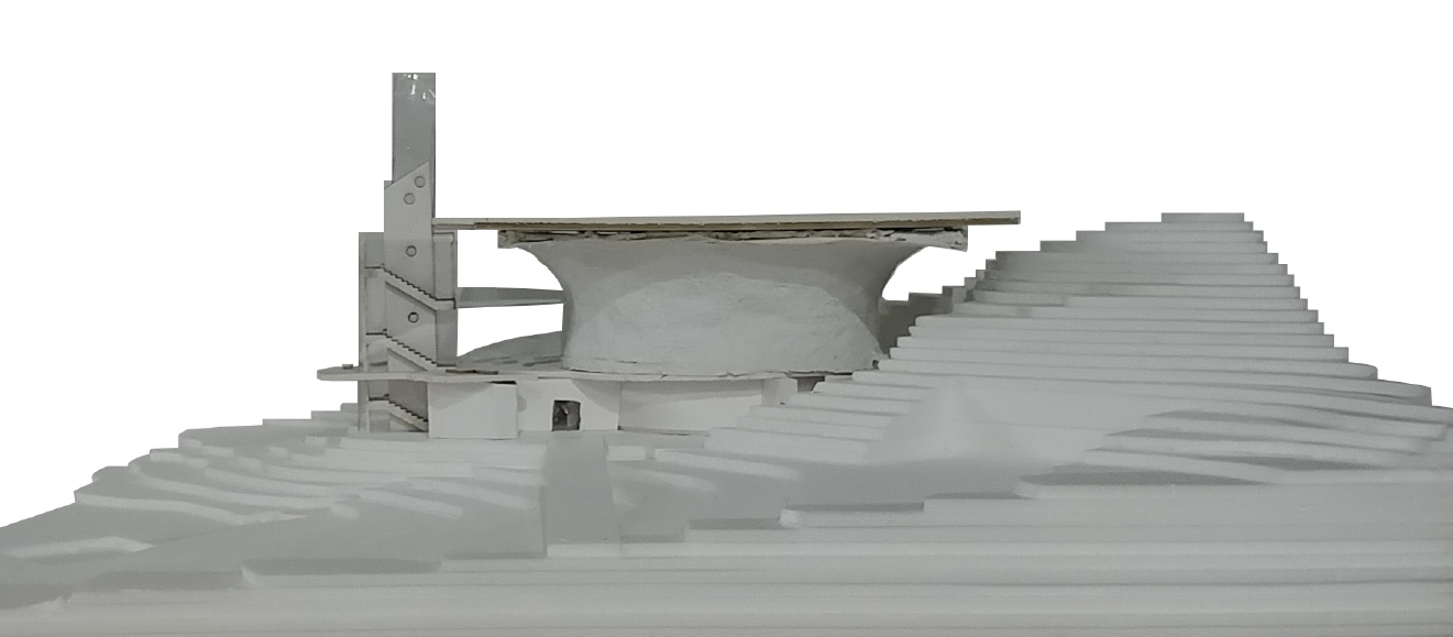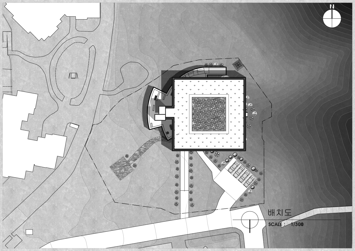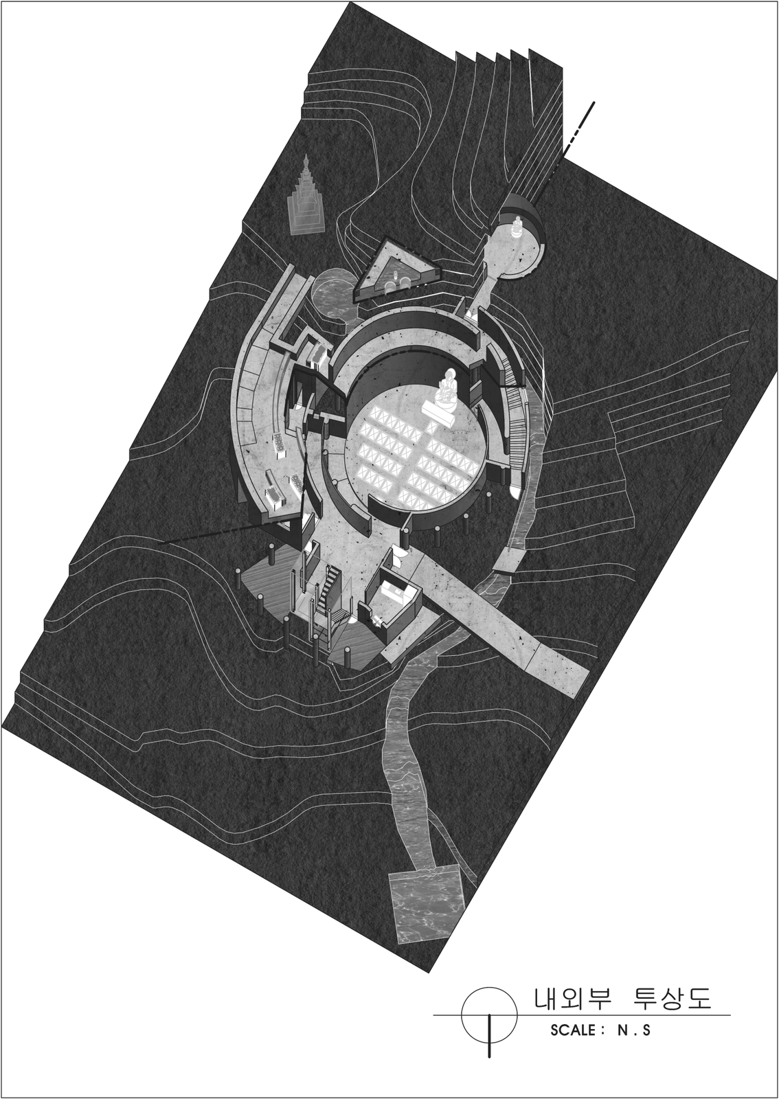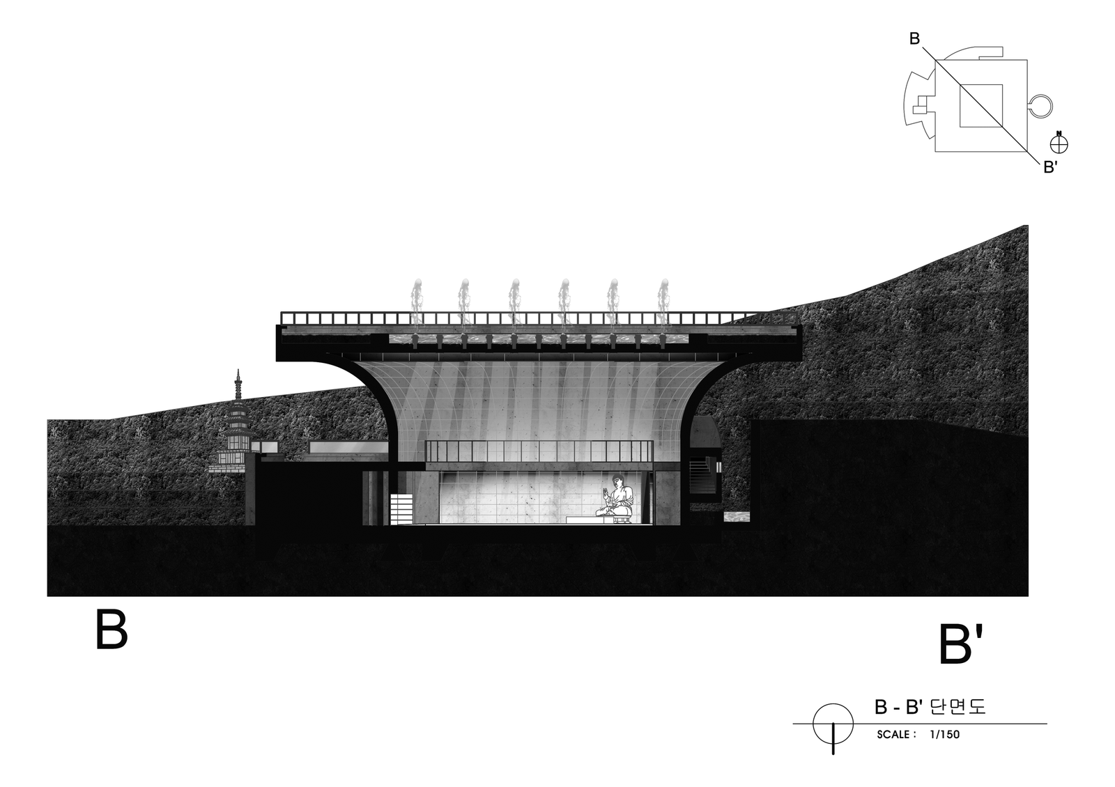 큰 컨셉은 동적인 외부공간과 정적인 내부공간의 대비로 볼 수 있다. 이러한 대비를 극적으로 표현하기 위하여 물을 사용하였다. 우리는 시끄러운 수영장에서 잠수했을 때, 그 요란스럽던 소리가 물에 의하여 먹혀서 웅웅거리는 경험을 하곤 한다. 바로 그 때 느끼는 평안함, 고요함의 감정을 법당 내에서 재현하고자 천창 위의 물을 통과하여 들어오는 빛의 공간을 설계하였다. 즉, 물 바깥의 속세와 내부의 평온한 세계로 나눌 수 있다는 것이다. 마음의 평온함은 우리가 윤회하는 속세의 덧없음을 깨닫고 열반에 이를 수 있도록 이끌어준다.